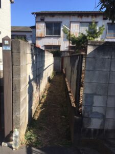 この道を本当に進んでいいのだろうか…と少し不安になるほどの細道を抜けると、その奥に今回の対象となるアパートが現れます。